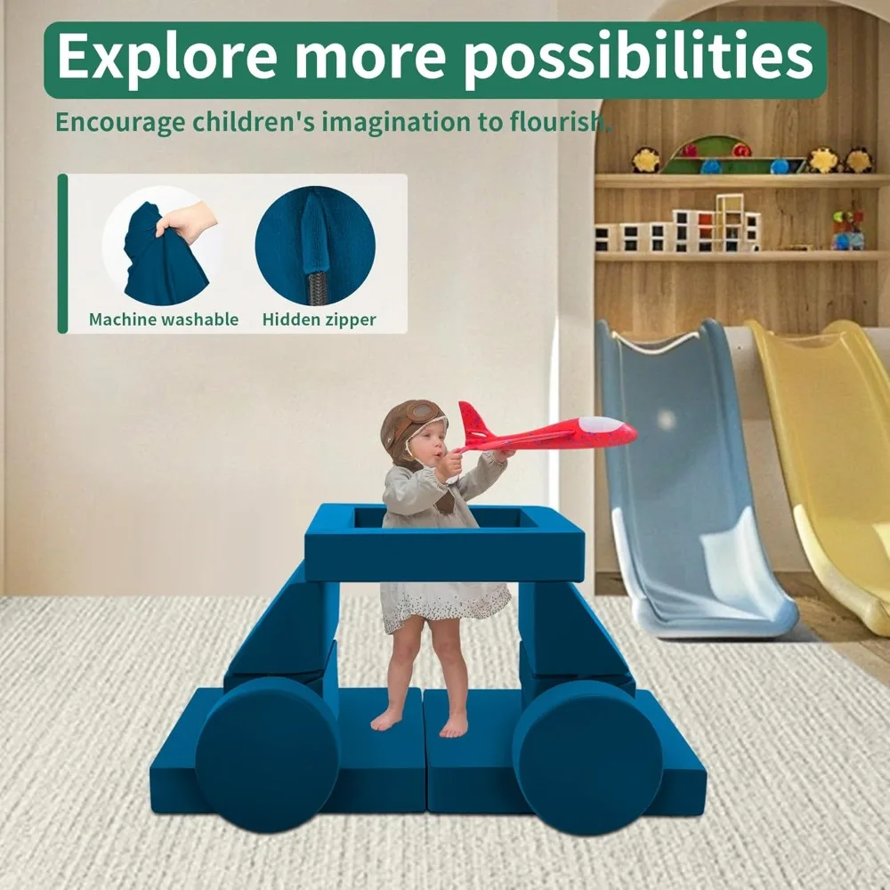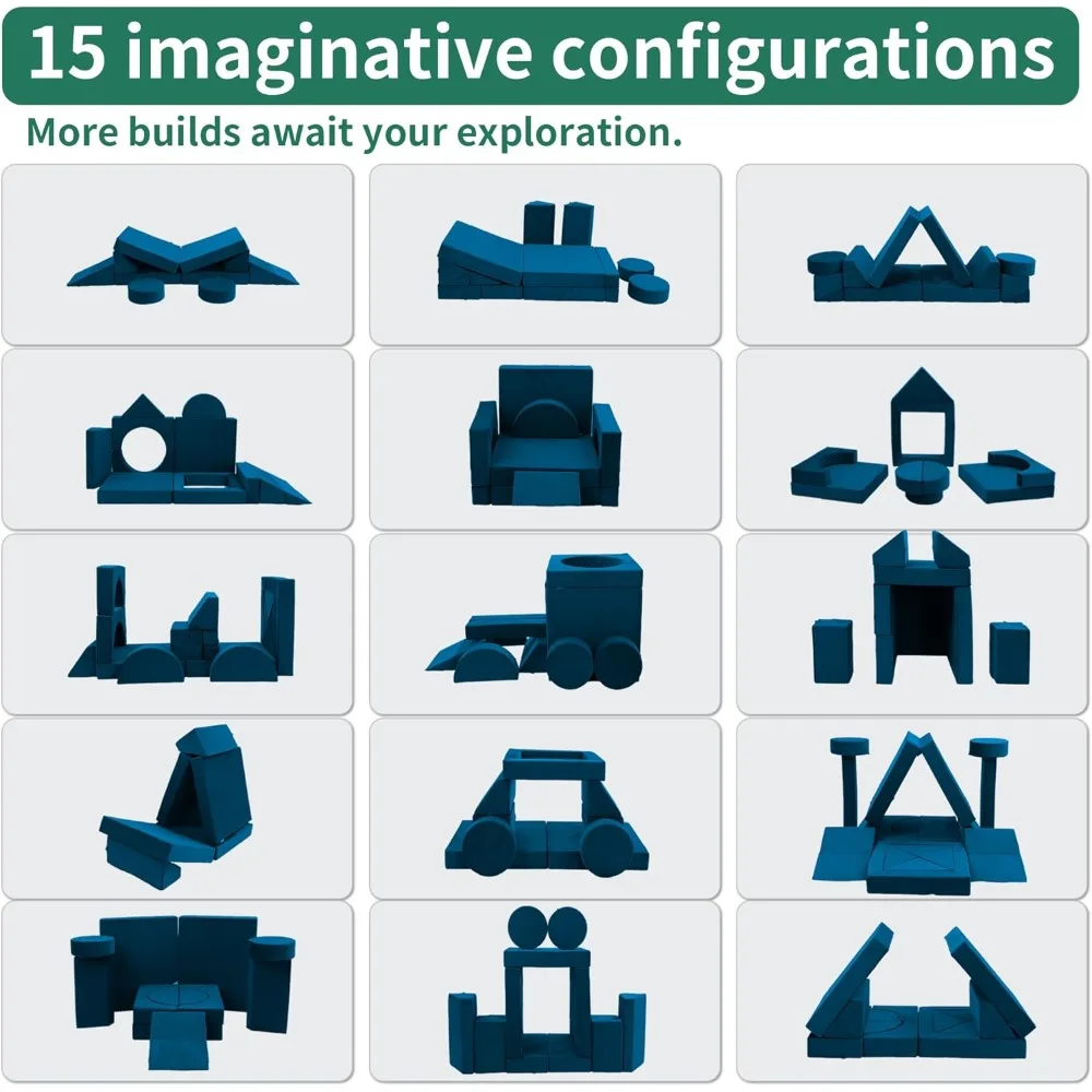 - 18pcs modular foam pieces to stack and play. Kids can transform it into anything they imagine, from a pirate ship for adventures to a comfy reading nook or a secret clubhouse for friends.