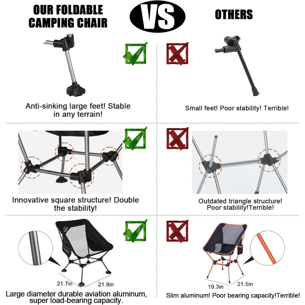 - ✅HIGH STABILITY&SUPER SAFETY:The camp chair uses an upgraded rectangular frame instead of the original triangular frame, and the addition of a big foot cover,which enhances the stability of the chair, no matter whether you lean forward or back, you don't have to worry about the chair falling over. A stable and secure structure allows you to enjoy complete relaxation.