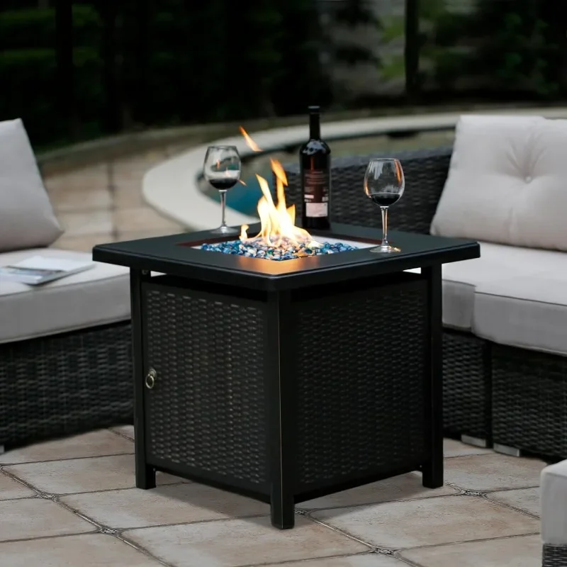 28 Inch Propane Fire Pit Rattan & Wicker-Look with Blue Fire Glass