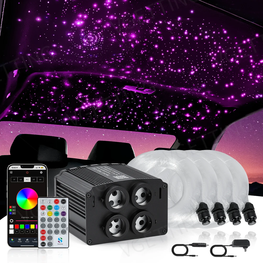 4 Port Twinkle Car Roof Star Light Fiber Optic Light Ceiling Starry Sky Lamp RGBW APP Music Remote Control Interior Atmosphere