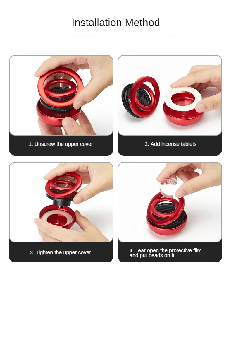 unscrew the cover, put the perfume pad into and screw the cover, tear the tape to fix the air freshener.