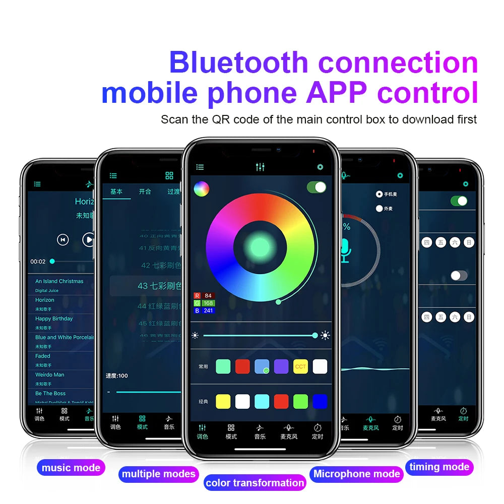 Download the application by the QR code on the main control box first, control light mode via Bluetooth connection. This product include 1 main control box ,4 sub control box. Each controller has a power cable, the main controller is connected to a 5-12V power supply, and the sub controller also needs to be connected to a 5- 12v power supply such as a door power supply. Each controller has 4 connection ports, and users can DIY the position of each light by themselves. Not diffcult to install our product.