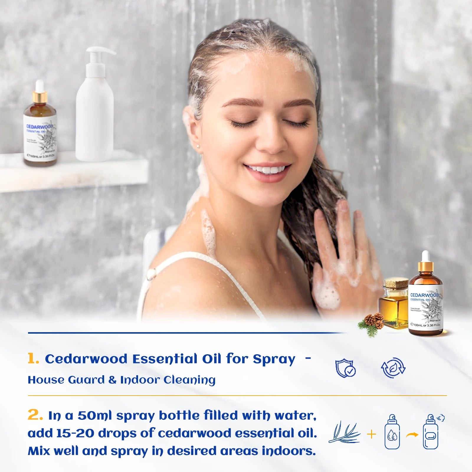 Hair Care: Add 1-2 drops of cedar oil to shampoo and conditioner and use on hair,while the hair is still wet, apply 10 drops of cedar essential oil to the scalp and massage gently on the scalp for better results,wash off with shampoo.