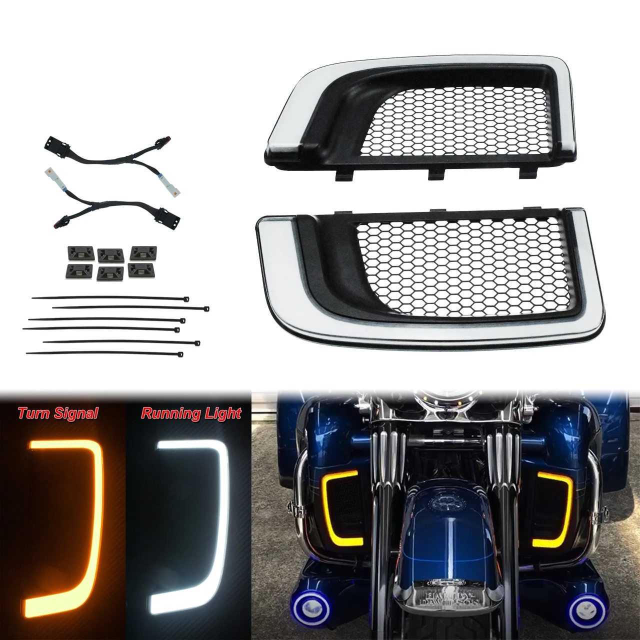 Motorcycle Black LED Fairing Lower Grills Turn Signal Running Light Harley