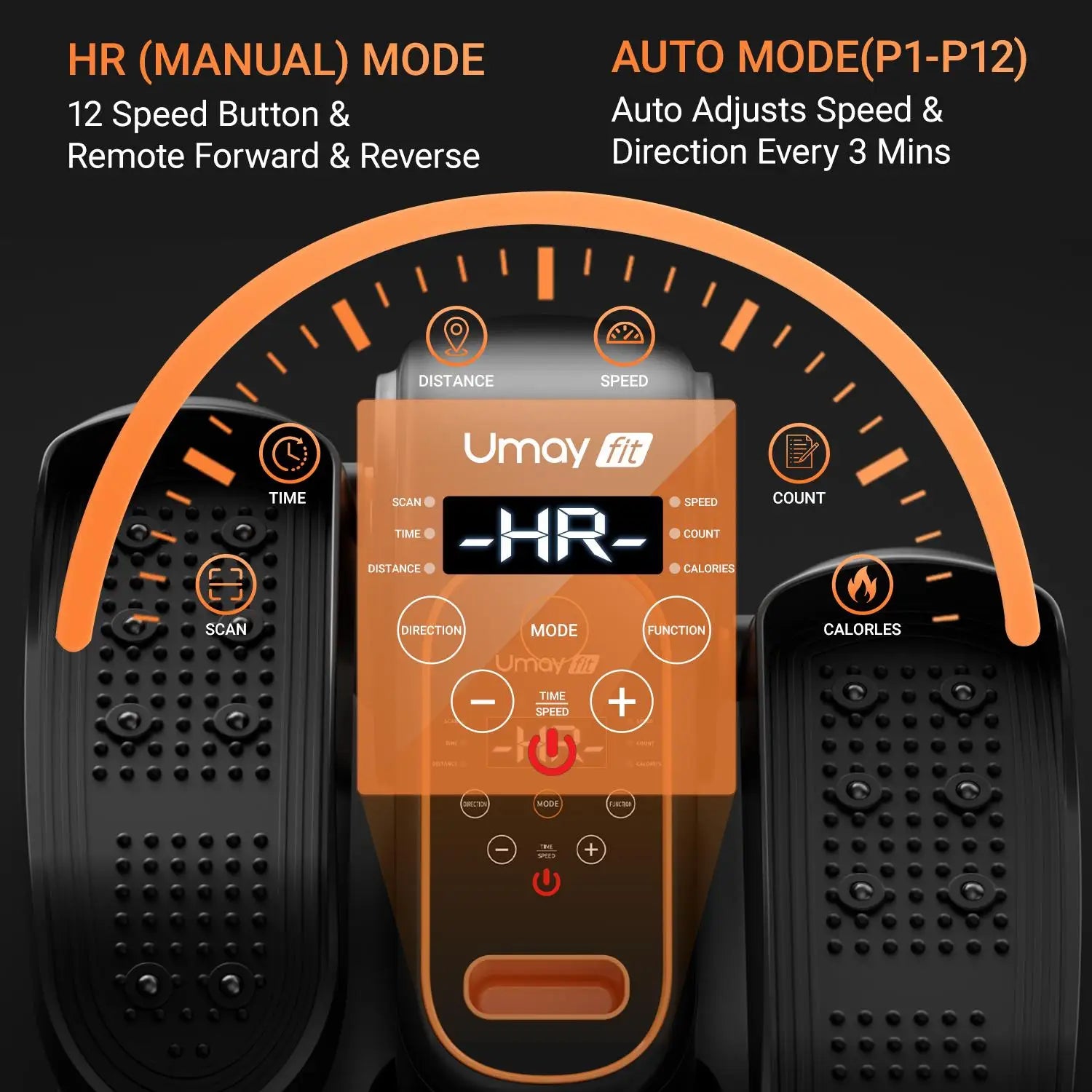 Auto & Manual Modes: UMAY elliptical provides Auto & Manual Modes for you, elderly people can choose 1-4 levels of low speed for leg exercise and relaxation. In Manual mode, you can set workout time of 15-30min, 12 speeds and forward&backward direction by remote control or button of the elliptical machine. The speed and direction have been programmed in Auto mode, you can adjust P1-P12 mode by press mode button, the speed changes every minute and the direction changes every 3 minutes