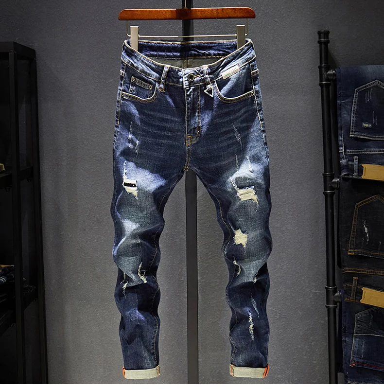 Ripped Jeans Slim Fit Dark Blue Destroyed Denim