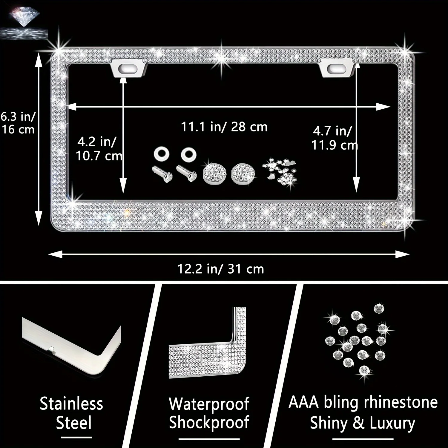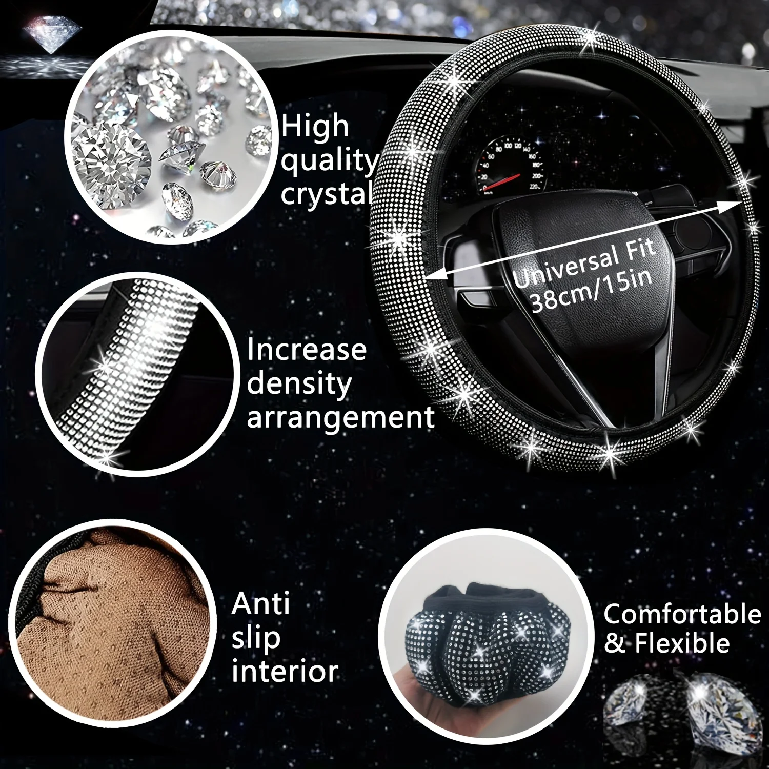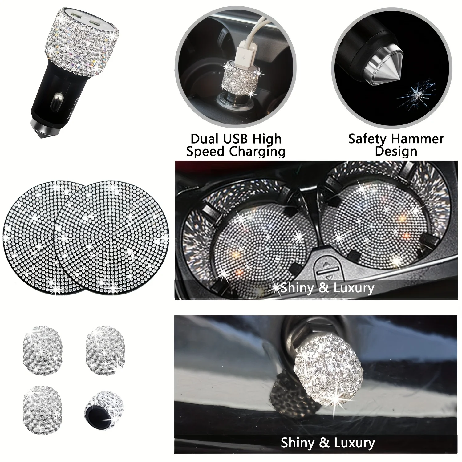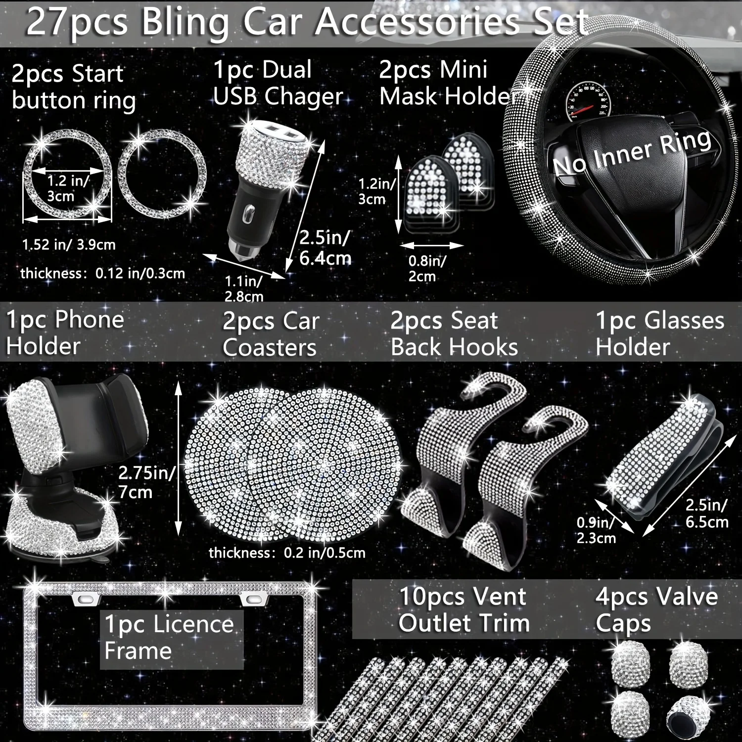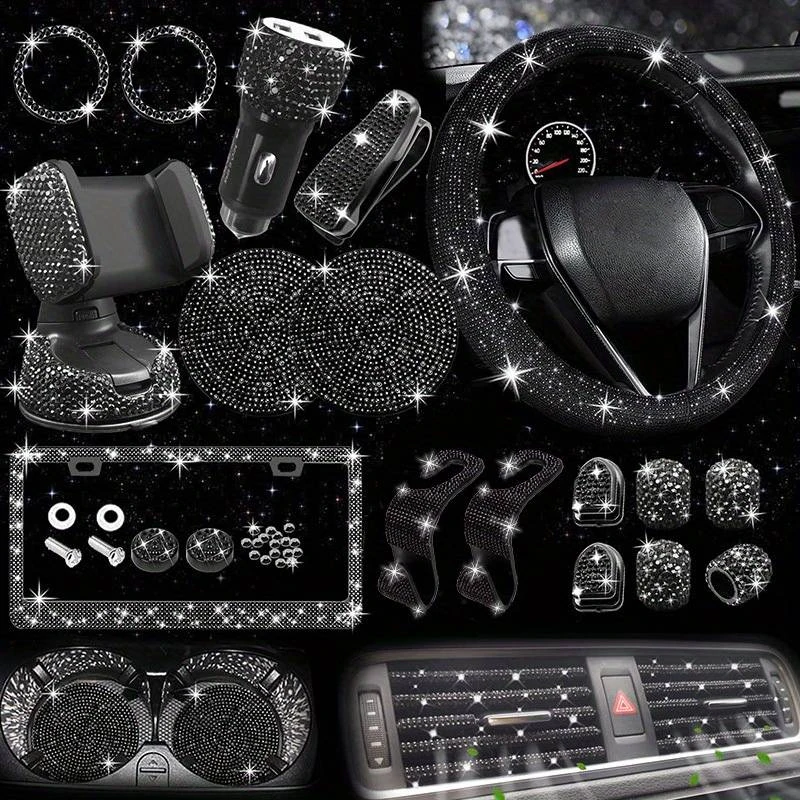 Set 27 Piece Women Bling Universal Fit Steering Cover Shiny License Frame Phone Holder Coasters Tools